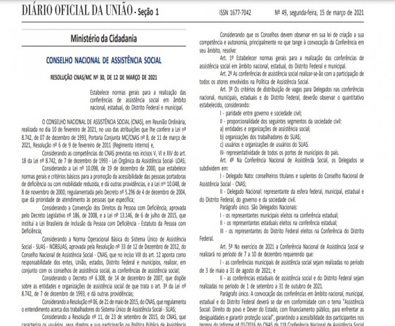 O Diário Oficial da União desta segunda-feira, 15 de março, trouxe a publicação da Resolução CNAS/MC - 30/2021, que estabelece as normas gerais para a realização das conferências de assistência social nacional, estadual,…
